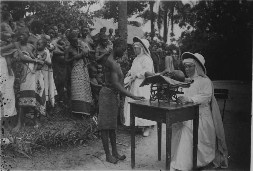 Along with this theme of Belgian colonial medicine, I am further struck by this image of a milk depot and baby clinic from “Medicine and Colonialism.” The Congolese women wrapped in pagnes holding their tiny babies and toddlers, the stark white of the nun-nurses, the sterility of their gaze. And the baby lying on the scale, seemingly hypnotic. A sense of fear. No one in this image appears happy, pious, or at ease. The article goes on to reference Nancy Hunt below.
