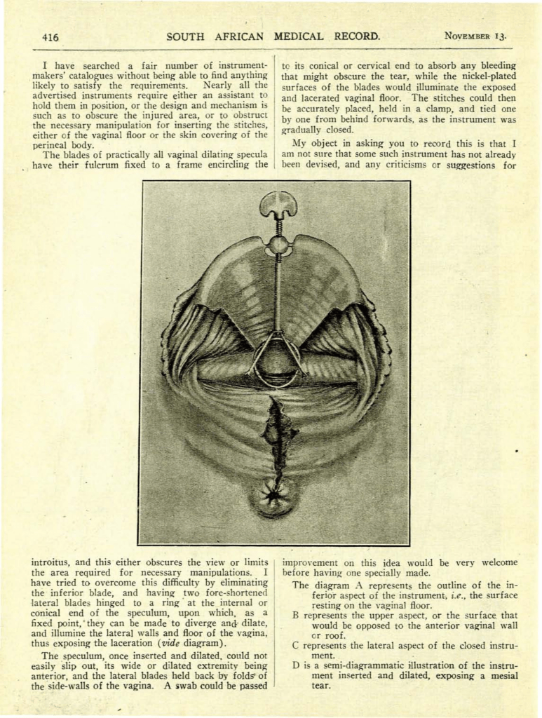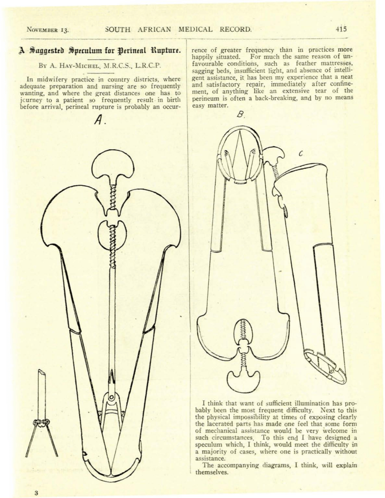 I researched the usage of speculums in childbirth and came up with little. I did find an old publication in the The South African Medical Record entitled “A suggested speculum for perineal rupture” by A. Hay Michel, M.R.C.S., LRCP (Nov. 13th, 1920). A comparison to J. Marion Sims (the white male obstetrician who invented the speculum through abusive procedures on enslaved women experiencing fistulas) is warranted, but I first see other connections.