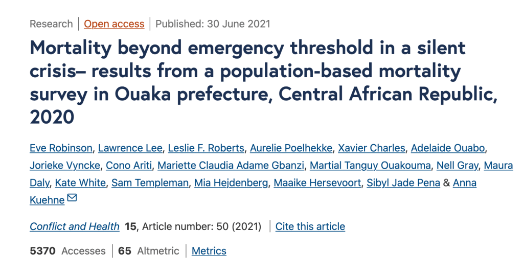 The best paper I found, is an epidemiology report from 2021 by Eve Robinson et. al, entitled “Mortality beyond emergency threshold in a silent crisis– results from a population based mortality survey in Ouaka prefecture, Central African Republic, 2020.” I chose to present it here, rather then earlier on, as I want it’s findings to be considered within the full scope of my project, that my combined methodology of ethnography, history, and midwifery would provide a good introduction to those who had never heard of C.A.R. prior.